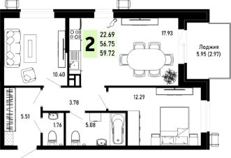 Продаётся 2-комнатная квартира в строящемся доме (квартал 9.1 литер 1), срок сдачи: IV-кв. 2026, общей площадью 59.72 кв.м., на 1 этаже. Новый жилой комплекс по ул. Николая Лебедева от застройщика ''ССК''
