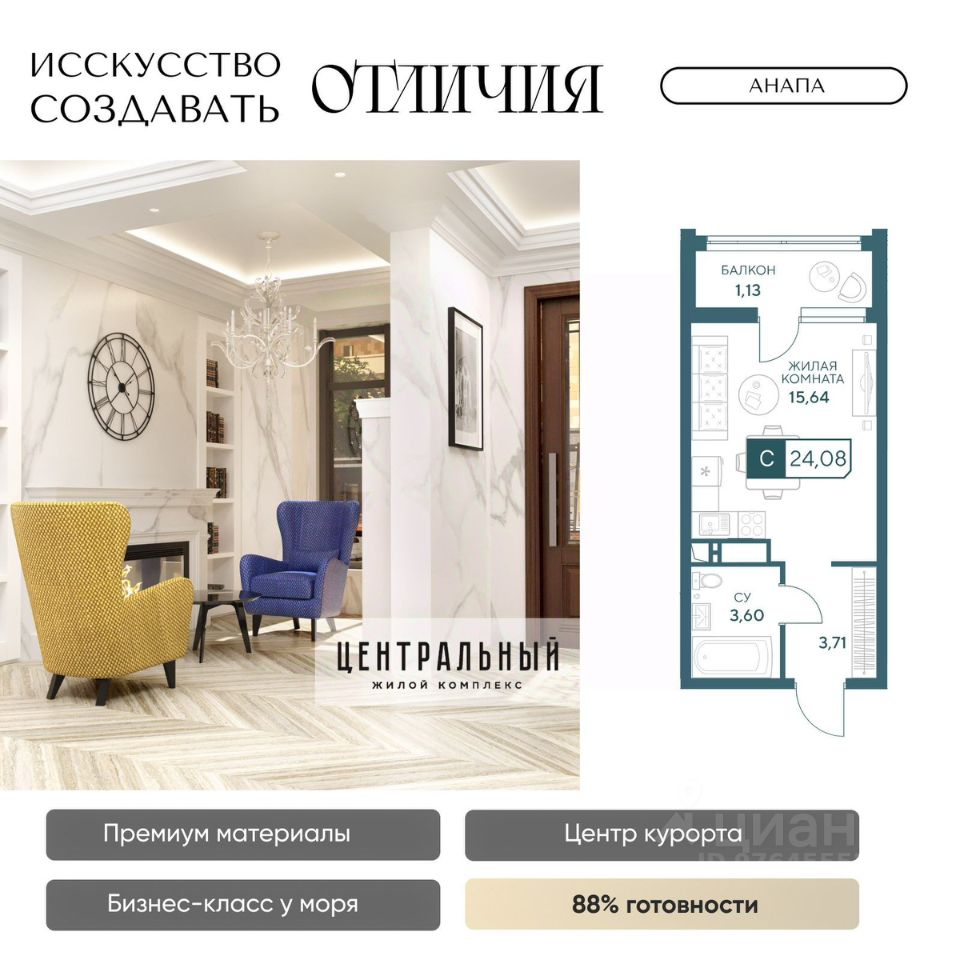 Жилой комплекс бизнес-класса ''Центральный'' в Анапе. Образец архитектурного искусства в центре курорта, для вашей респектабельной жизни у моря. Готов на 85%, сдаем уже в 2026 году! Для тех, кто ценит долговечность материалов, море в 10 минутах и шикарные виды без туристической суеты, кто привык к современному комфорту, и ценит время. Жить в комфорте, а не в пробках просто. Магазины сильных брендов, эстетика натурального камня в торговой галерее прямо в доме. Красивый шоппинг и новая точка притяжения в городе ЖК бизнес-класса ''Центральный''. Кафе, пекарни, а также большой развлекательный центр для детей и своя частная гимназия. Натуральные материалы в отделке фасада и во дворе. Фасад из натурального мрамора выделяет дом на фоне остальных мозаикой из 4 песчаных оттенков. Камень прекрасен сам по себе, что в доказательствах не нуждается, ведь прослужит долгие годы и сохранит дом на целые поколения. Приватный двор с гранитными пешеходными дорожками и озеленением с более чем 50 видами деревьев и растений. Современные детские и спортивные площадки, зона отдыха с фонтаном и ароматным садом пряный трав. Релакс после насыщенного дня дома, в окружении пышной зелени, водным охлаждением в жару и в безопасности: ведь двор закрыт, и как дом, лифты и паркинг под наблюдением видеокамер 24/7. Лифты скоростные и бесшумные, оснащены оборудованием для стабильного сигнала мобильной связи, удобно доставят вас от двери квартиры в подземный паркинг. VIP-клиентам премиум квартиры в панорамной башне (квартиры закрыты к продаже, по согласованию с менеджером обсуждается персональная стоимость) Премиум предложения всего две квартиры на этаже общей площадью 130 м2. Индивидуальные лифты с доступном в паркинг, панорамное остекление с защитой от ультрафиолета, потрясающие виды на город и горы, в перспективе на Храм. Красивая жизнь в центре курорта в достойном окружении уже ждет! До новой квартиры у моря один звонок. Застройщик ''Гамма'': 8 ЖК в Анапе сдано точно в срок, славимся постоянными покупателями. Предоставим условия покупки, выгодные именно вам: рассрочка, ипотечные программы по сниженным ставкам и увеличенной суммой ипотеки.