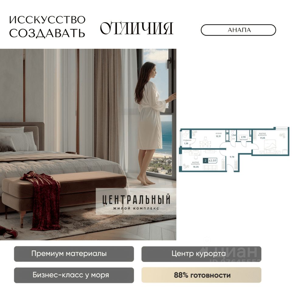Жилой комплекс бизнес-класса ''Центральный'' в Анапе. Образец архитектурного искусства в центре курорта, для вашей респектабельной жизни у моря. Готов на 85%, сдаем уже в 2026 году! Для тех, кто ценит долговечность материалов, море в 10 минутах и шикарные виды без туристической суеты, кто привык к современному комфорту, и ценит время. Жить в комфорте, а не в пробках просто. Магазины сильных брендов, эстетика натурального камня в торговой галерее прямо в доме. Красивый шоппинг и новая точка притяжения в городе ЖК бизнес-класса ''Центральный''. Кафе, пекарни, а также большой развлекательный центр для детей и своя частная гимназия. Натуральные материалы в отделке фасада и во дворе. Фасад из натурального мрамора выделяет дом на фоне остальных мозаикой из 4 песчаных оттенков. Камень прекрасен сам по себе, что в доказательствах не нуждается, ведь прослужит долгие годы и сохранит дом на целые поколения. Приватный двор с гранитными пешеходными дорожками и озеленением с более чем 50 видами деревьев и растений. Современные детские и спортивные площадки, зона отдыха с фонтаном и ароматным садом пряный трав. Релакс после насыщенного дня дома, в окружении пышной зелени, водным охлаждением в жару и в безопасности: ведь двор закрыт, и как дом, лифты и паркинг под наблюдением видеокамер 24/7. Лифты скоростные и бесшумные, оснащены оборудованием для стабильного сигнала мобильной связи, удобно доставят вас от двери квартиры в подземный паркинг. VIP-клиентам премиум квартиры в панорамной башне (квартиры закрыты к продаже, по согласованию с менеджером обсуждается персональная стоимость) Премиум предложения всего две квартиры на этаже общей площадью 130 м2. Индивидуальные лифты с доступном в паркинг, панорамное остекление с защитой от ультрафиолета, потрясающие виды на город и горы, в перспективе на Храм. Красивая жизнь в центре курорта в достойном окружении уже ждет! До новой квартиры у моря один звонок. Застройщик ''Гамма'': 8 ЖК в Анапе сдано точно в срок, славимся постоянными покупателями. Предоставим условия покупки, выгодные именно вам: рассрочка, ипотечные программы по сниженным ставкам и увеличенной суммой ипотеки.
