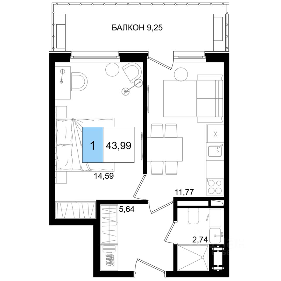 Общая площадь43,99 м2