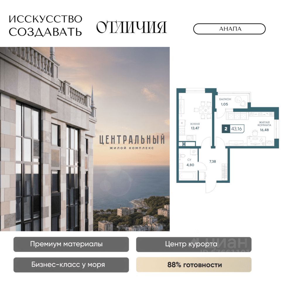 Жилой комплекс бизнес-класса ''Центральный'' в Анапе. Образец архитектурного искусства в центре курорта, для вашей респектабельной жизни у моря. Готов на 85%, сдаем уже в 2026 году! Для тех, кто ценит долговечность материалов, море в 10 минутах и шикарные виды без туристической суеты, кто привык к современному комфорту, и ценит время. Жить в комфорте, а не в пробках просто. Магазины сильных брендов, эстетика натурального камня в торговой галерее прямо в доме. Красивый шоппинг и новая точка притяжения в городе ЖК бизнес-класса ''Центральный''. Кафе, пекарни, а также большой развлекательный центр для детей и своя частная гимназия. Натуральные материалы в отделке фасада и во дворе. Фасад из натурального мрамора выделяет дом на фоне остальных мозаикой из 4 песчаных оттенков. Камень прекрасен сам по себе, что в доказательствах не нуждается, ведь прослужит долгие годы и сохранит дом на целые поколения. Приватный двор с гранитными пешеходными дорожками и озеленением с более чем 50 видами деревьев и растений. Современные детские и спортивные площадки, зона отдыха с фонтаном и ароматным садом пряный трав. Релакс после насыщенного дня дома, в окружении пышной зелени, водным охлаждением в жару и в безопасности: ведь двор закрыт, и как дом, лифты и паркинг под наблюдением видеокамер 24/7. Лифты скоростные и бесшумные, оснащены оборудованием для стабильного сигнала мобильной связи, удобно доставят вас от двери квартиры в подземный паркинг. VIP-клиентам премиум квартиры в панорамной башне (квартиры закрыты к продаже, по согласованию с менеджером обсуждается персональная стоимость) Премиум предложения всего две квартиры на этаже общей площадью 130 м2. Индивидуальные лифты с доступном в паркинг, панорамное остекление с защитой от ультрафиолета, потрясающие виды на город и горы, в перспективе на Храм. Красивая жизнь в центре курорта в достойном окружении уже ждет! До новой квартиры у моря один звонок. Застройщик ''Гамма'': 8 ЖК в Анапе сдано точно в срок, славимся постоянными покупателями. Предоставим условия покупки, выгодные именно вам: рассрочка, ипотечные программы по сниженным ставкам и увеличенной суммой ипотеки.