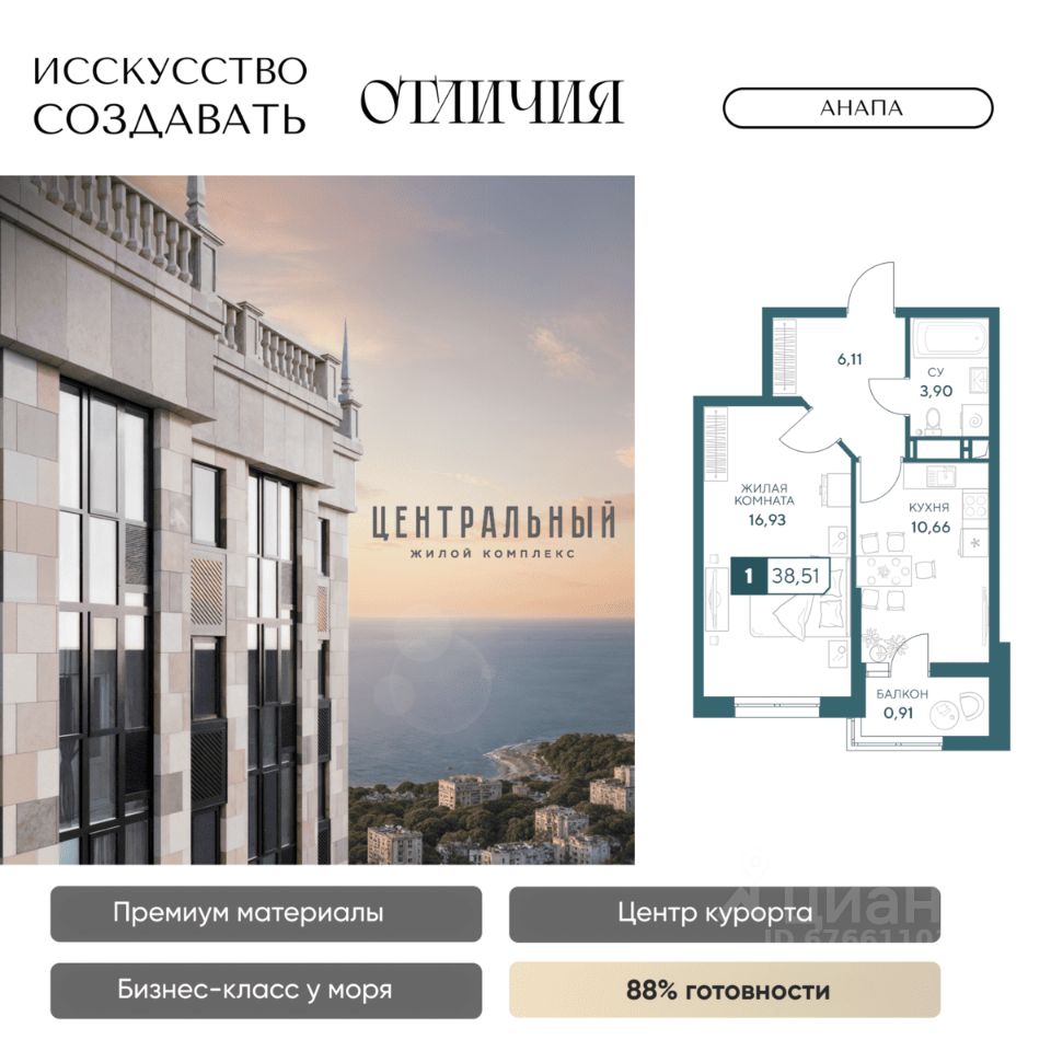 Жилой комплекс бизнес-класса ''Центральный'' в Анапе. Образец архитектурного искусства в центре курорта, для вашей респектабельной жизни у моря. Готов на 85%, сдаем уже в 2026 году! Для тех, кто ценит долговечность материалов, море в 10 минутах и шикарные виды без туристической суеты, кто привык к современному комфорту, и ценит время. Жить в комфорте, а не в пробках просто. Магазины сильных брендов, эстетика натурального камня в торговой галерее прямо в доме. Красивый шоппинг и новая точка притяжения в городе ЖК бизнес-класса ''Центральный''. Кафе, пекарни, а также большой развлекательный центр для детей и своя частная гимназия. Натуральные материалы в отделке фасада и во дворе. Фасад из натурального мрамора выделяет дом на фоне остальных мозаикой из 4 песчаных оттенков. Камень прекрасен сам по себе, что в доказательствах не нуждается, ведь прослужит долгие годы и сохранит дом на целые поколения. Приватный двор с гранитными пешеходными дорожками и озеленением с более чем 50 видами деревьев и растений. Современные детские и спортивные площадки, зона отдыха с фонтаном и ароматным садом пряный трав. Релакс после насыщенного дня дома, в окружении пышной зелени, водным охлаждением в жару и в безопасности: ведь двор закрыт, и как дом, лифты и паркинг под наблюдением видеокамер 24/7. Лифты скоростные и бесшумные, оснащены оборудованием для стабильного сигнала мобильной связи, удобно доставят вас от двери квартиры в подземный паркинг. VIP-клиентам премиум квартиры в панорамной башне (квартиры закрыты к продаже, по согласованию с менеджером обсуждается персональная стоимость) Премиум предложения всего две квартиры на этаже общей площадью 130 м2. Индивидуальные лифты с доступном в паркинг, панорамное остекление с защитой от ультрафиолета, потрясающие виды на город и горы, в перспективе на Храм. Красивая жизнь в центре курорта в достойном окружении уже ждет! До новой квартиры у моря один звонок. Застройщик ''Гамма'': 8 ЖК в Анапе сдано точно в срок, славимся постоянными покупателями. Предоставим условия покупки, выгодные именно вам: рассрочка, ипотечные программы по сниженным ставкам и увеличенной суммой ипотеки.