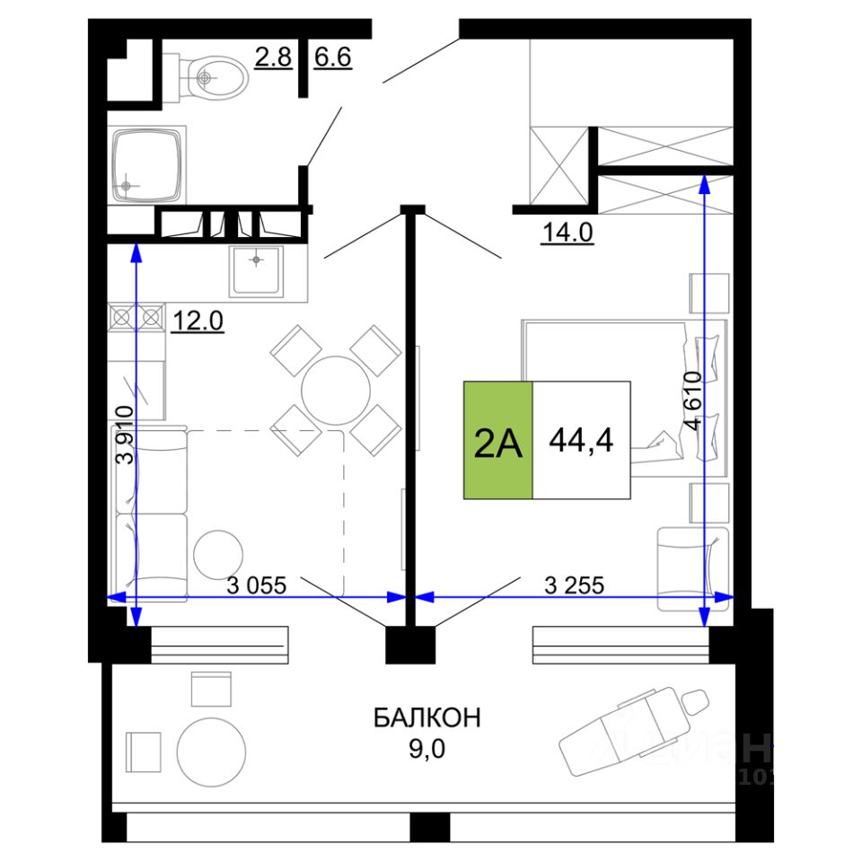 Общая площадь44,4 м2