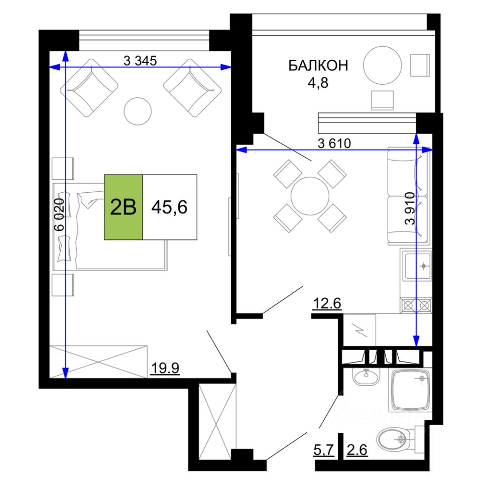 Общая площадь45,6 м2