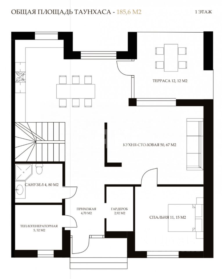 Два полноценных этажа с собственным двором и террасой: -на первом этаже расположена большая кухня-столовая площадью-50,67кв.м. с выделеной зоной кухни для приготовления, изолированная спальня-11,15кв.м, гостевой санузел, котельная, прихожая и гардеробная комната. Также из кухни есть выход на открытую террасу-12,12кв.м, с выходом во внутренний двор, где можно наслаждаться чистым морским воздухом, или просто отдохнуть от городской суеты. -на втором этаже три полноценных спальни, в каждой из которых есть выход на балкон, совмещенный санузел, коридор и вместительная гардеробная комната-5,76кв.м.