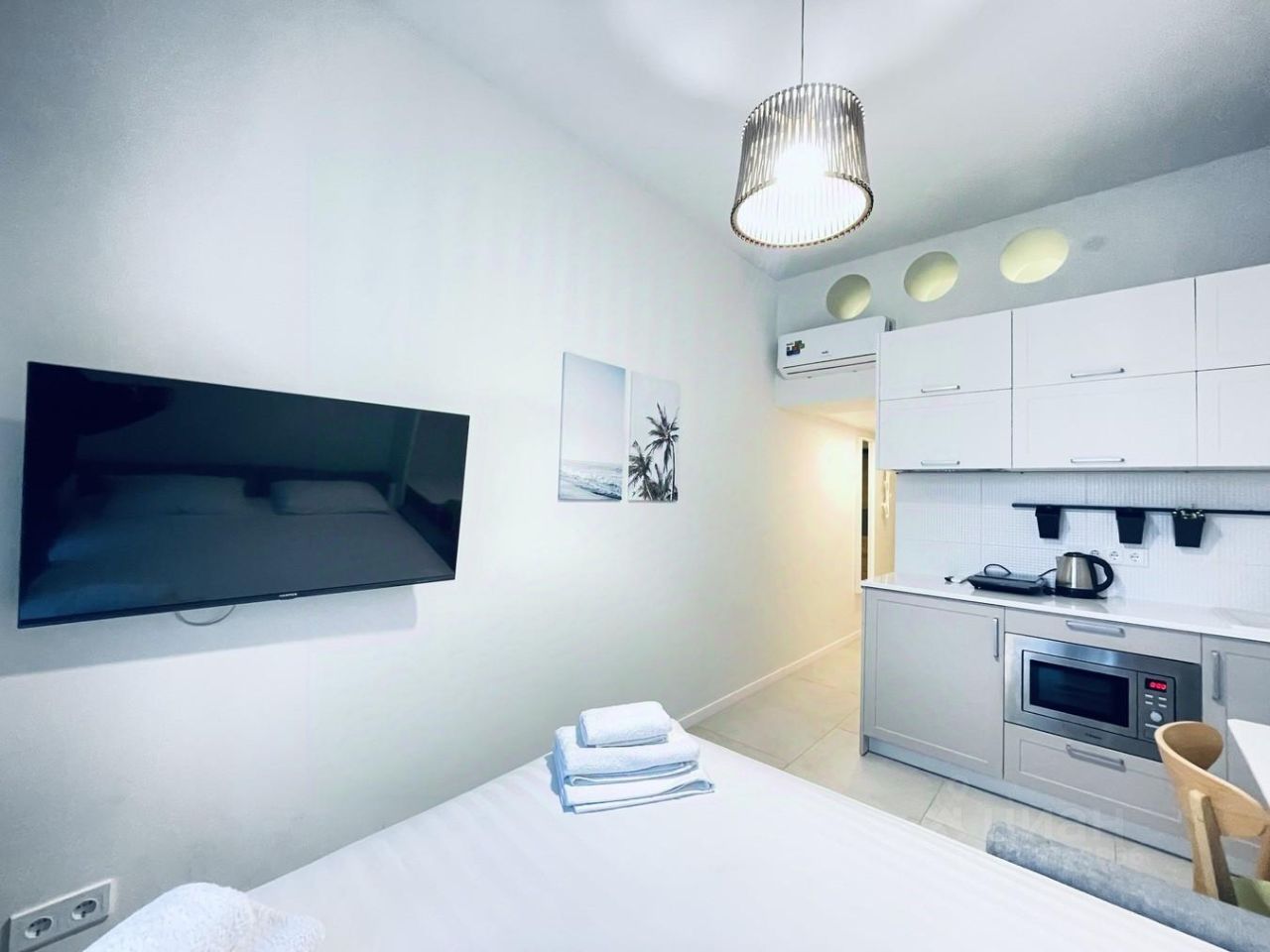 О КВАРТИРЕ: Площадь — 21,4 квадратных метра. Апартамент имеет два уровня. Здесь есть всё необходимое: техника, мебель, стиральная машина, чайник, микроволновая печь, холодильник, кухонная зона с плитой, телевизор, приборы, мягкая мебель, двуспальная кровать. На втором этаже расположены две раздельные кровати.