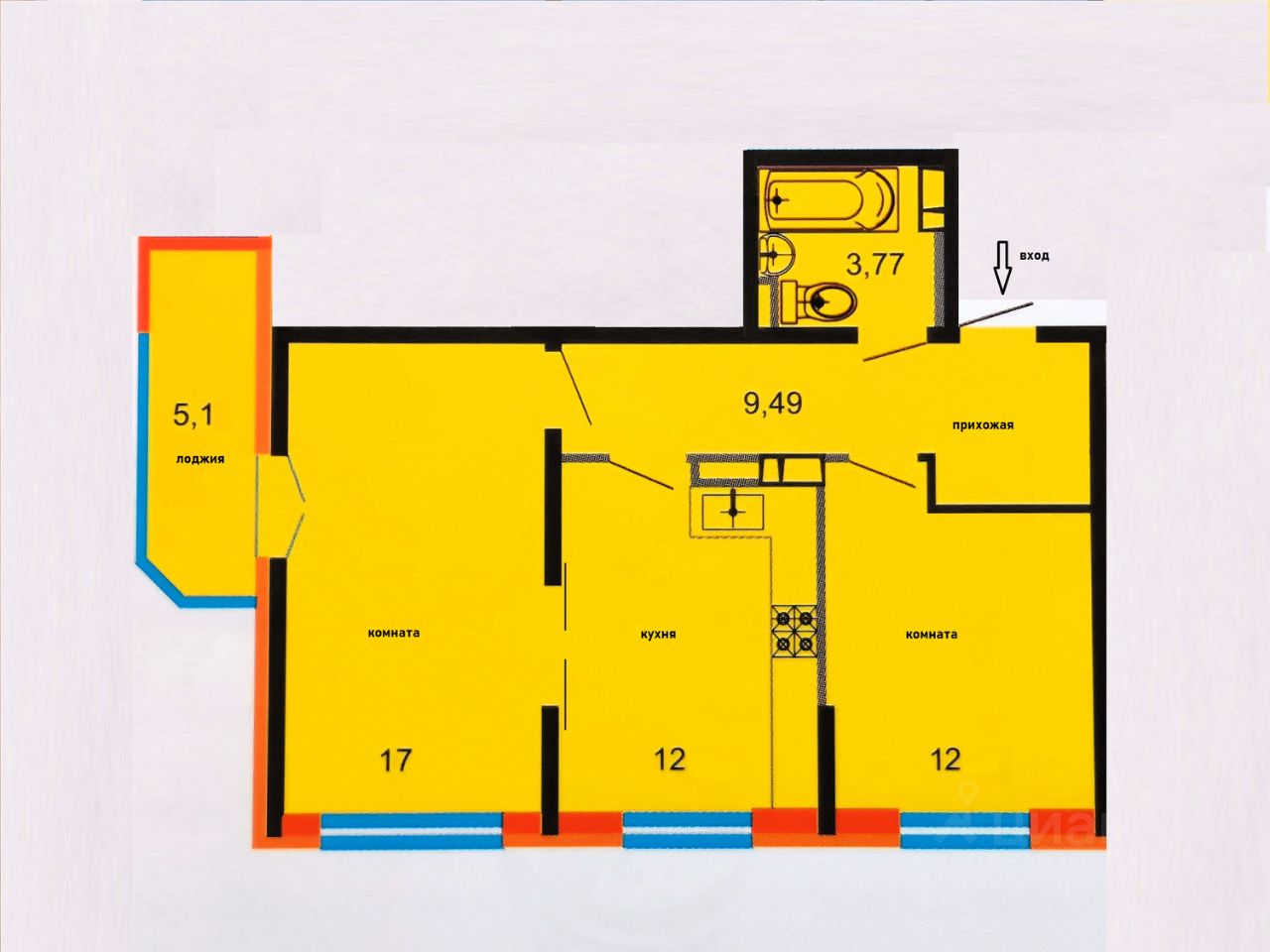 ПЛАНИРОВКА общая площадь 58 кв.м, кухня 12 кв.м, комнаты 11 кв.м. и 17 кв.м, коридор 9 кв.м, санузел 3,8 кв.м, балкон 5 кв.м.