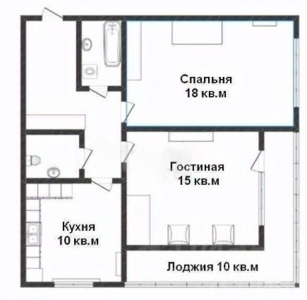 Удобная планировка: - Просторная кухня 10 кв.м., - Две комнаты по 18 и 15 кв.м.