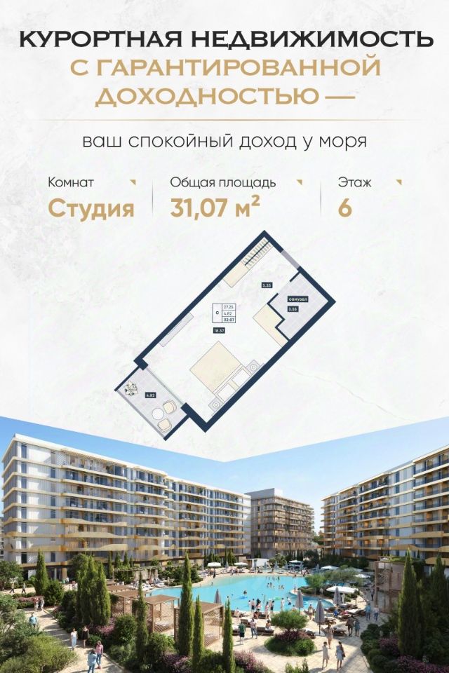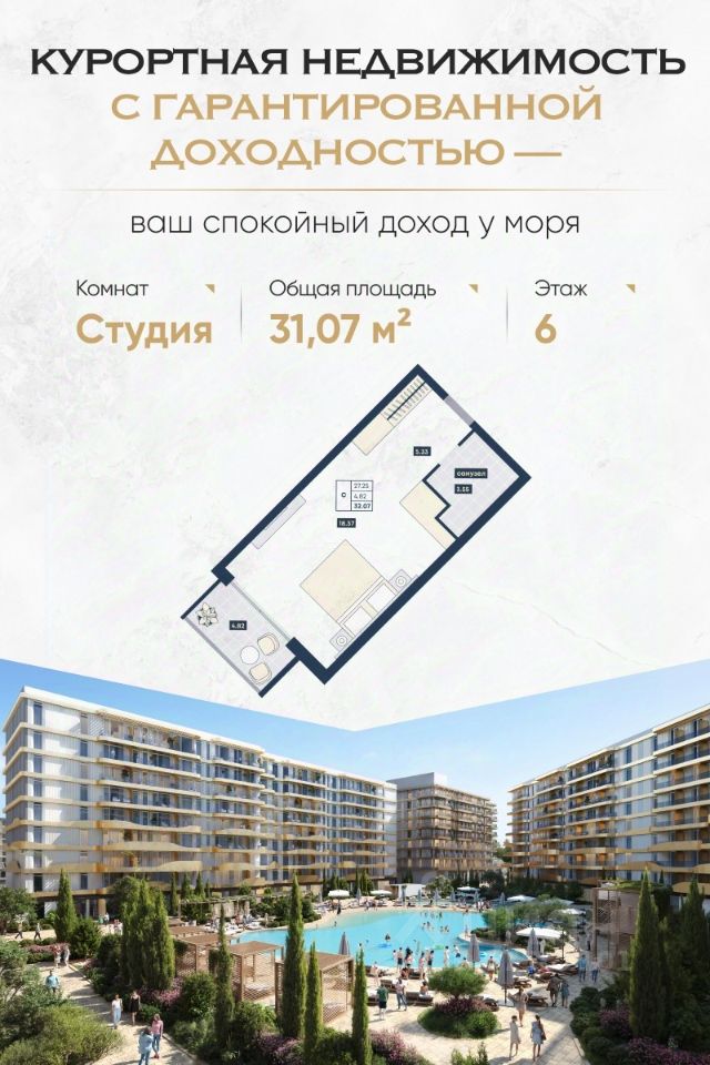 Формат — апартаменты с отделкой от ''Azimut'' Номера передаются с полным оснащением по высоким отельным стандартам. Управление и загрузка на стороне опытной управляющей компании. Вы получаете доход без вовлечённости.