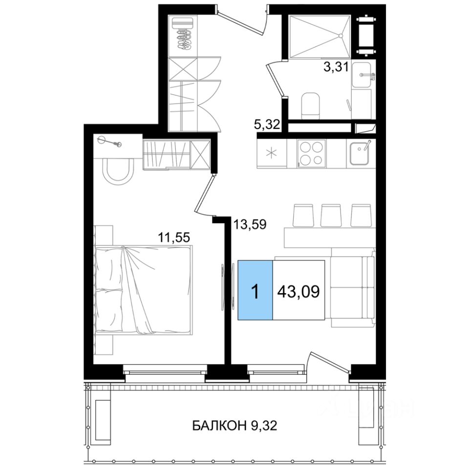 Общая площадь43,09 м2
