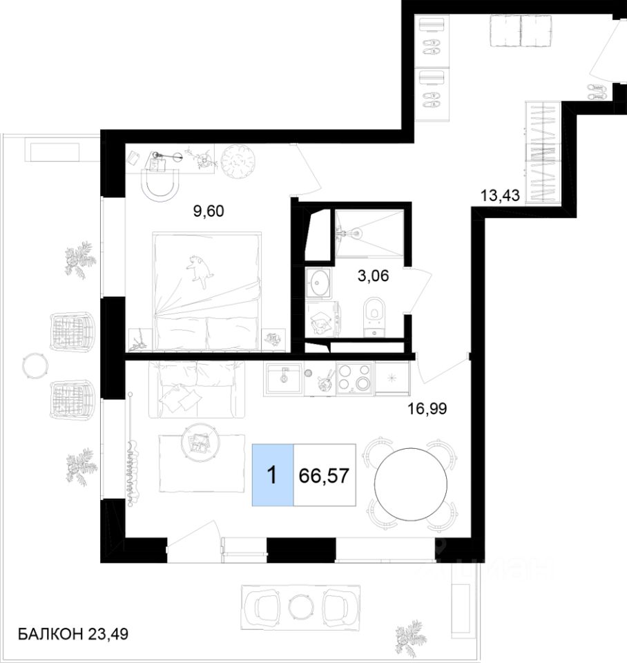 Общая площадь66,57 м2