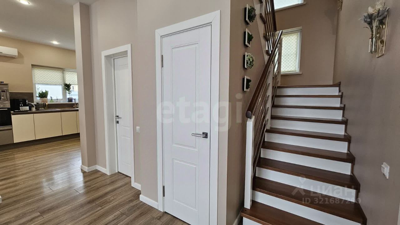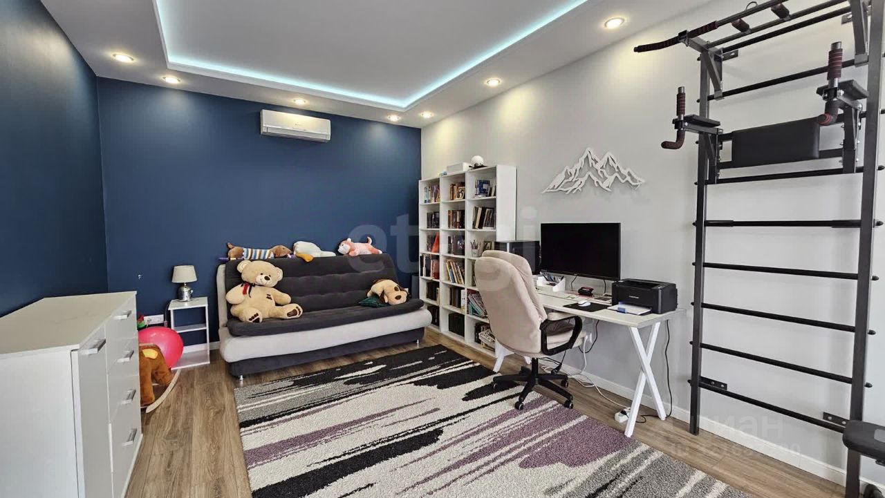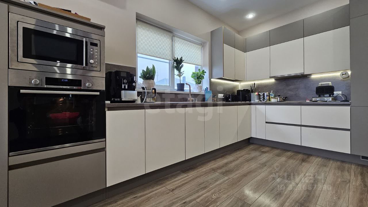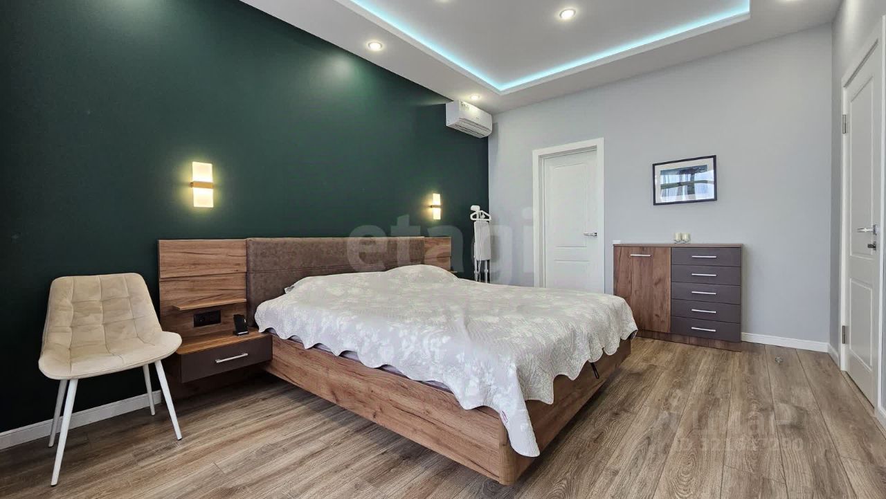 180м², 3 спальни, 1 кабинет, зал и кухня-гостиная. Два санузла, гардеробная, котельная, кладовая, балкон и терраса.