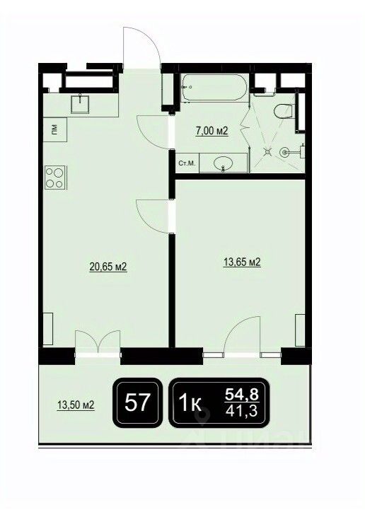Общая площадь54,8 м2