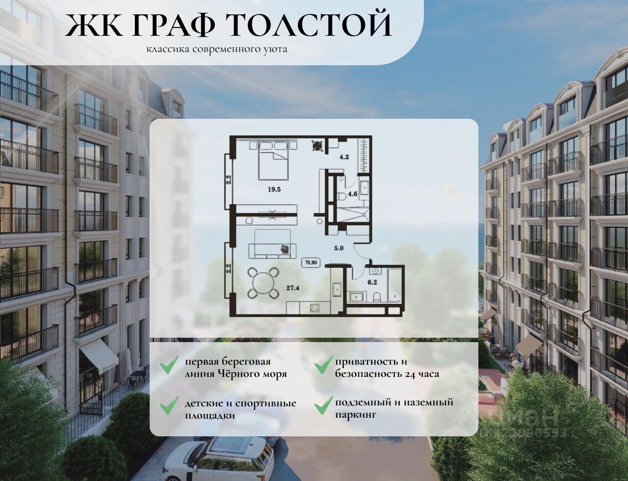 Особенности ''Граф Толстой'': - Расположенный на первой береговой линии Черного моря, комплекс состоит из двух корпусов в престижном районе города, сочетающем в себе природный ландшафт и современную инфраструктуру. - Здесь вы сможете насладиться гармонией горных пейзажей, чистотой небес и освежающим морским бризом, находя убежище от городской суеты и находя вдохновение для новых свершений.