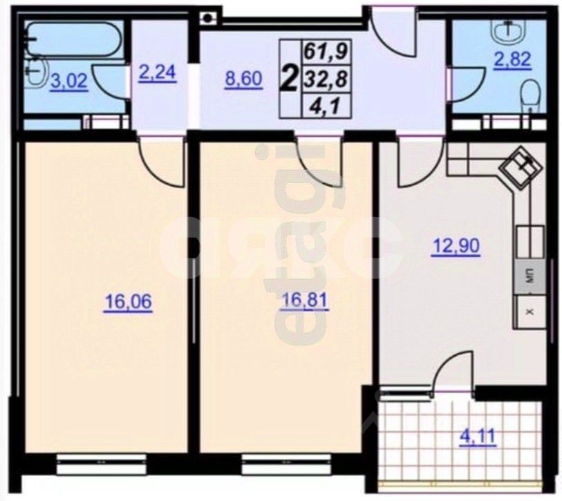 Характеристики и функциональные зоны объекта: Комната 16,06 кв.м. 16,81, большая площадь комнат поможет обустроить их как Вам будет удобно Кухня 12,9 кв.м., поможет легко разместиться всей семье за большим обеденным столом Санузлы, 2,82 и 3,02 кв.м., помогут не ждать длинную очередь Прихожая 8,6 кв.м., в которой установлен большой шкаф-купе в который поместиться всё Лоджия 4,11 кв.м., дополнительное место для решения бытовых задач