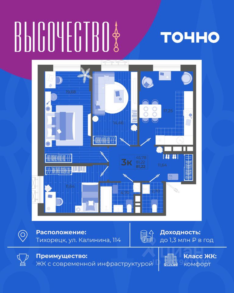 ''Высочество'' — первый ЖК комфорт-класса в Тихорецке. Современные технологии, новейшие представления о комфорте и эргономике жилья -это, то, что характеризует этот комплекс. Расположен в самом центре города. ''Высочество'' — это полностью самостоятельный жилой комплекс, жителей которого порадуют закрытый и свободный от машин двор, коммерческая галерея, спортивные и детские площадки с перголами для отдыха, уютная мангальная зона. По периметру жилого комплекса - открытый бесплатный паркинг на 370 м/мест. Недалеко от ЖК ''Высочество'' находятся детский сад, школы-гимназии, поликлиника, торговый центр, в пешей доступности расположен любимый сквер жителей города ''Звездный''.
