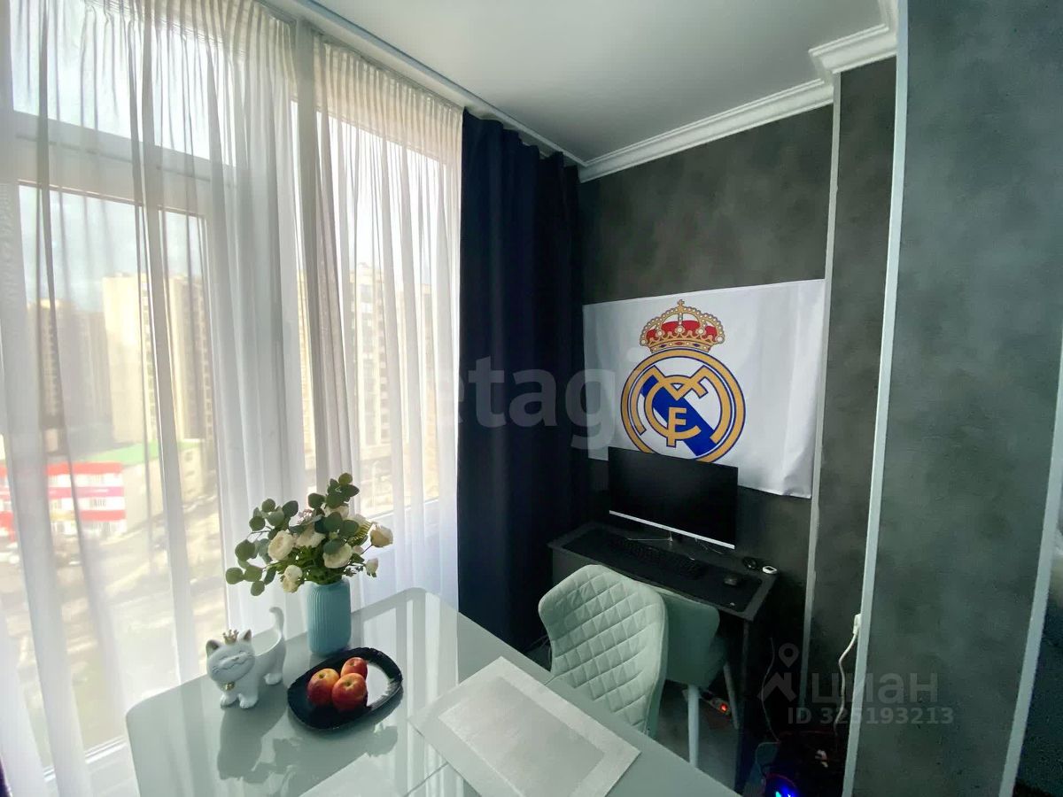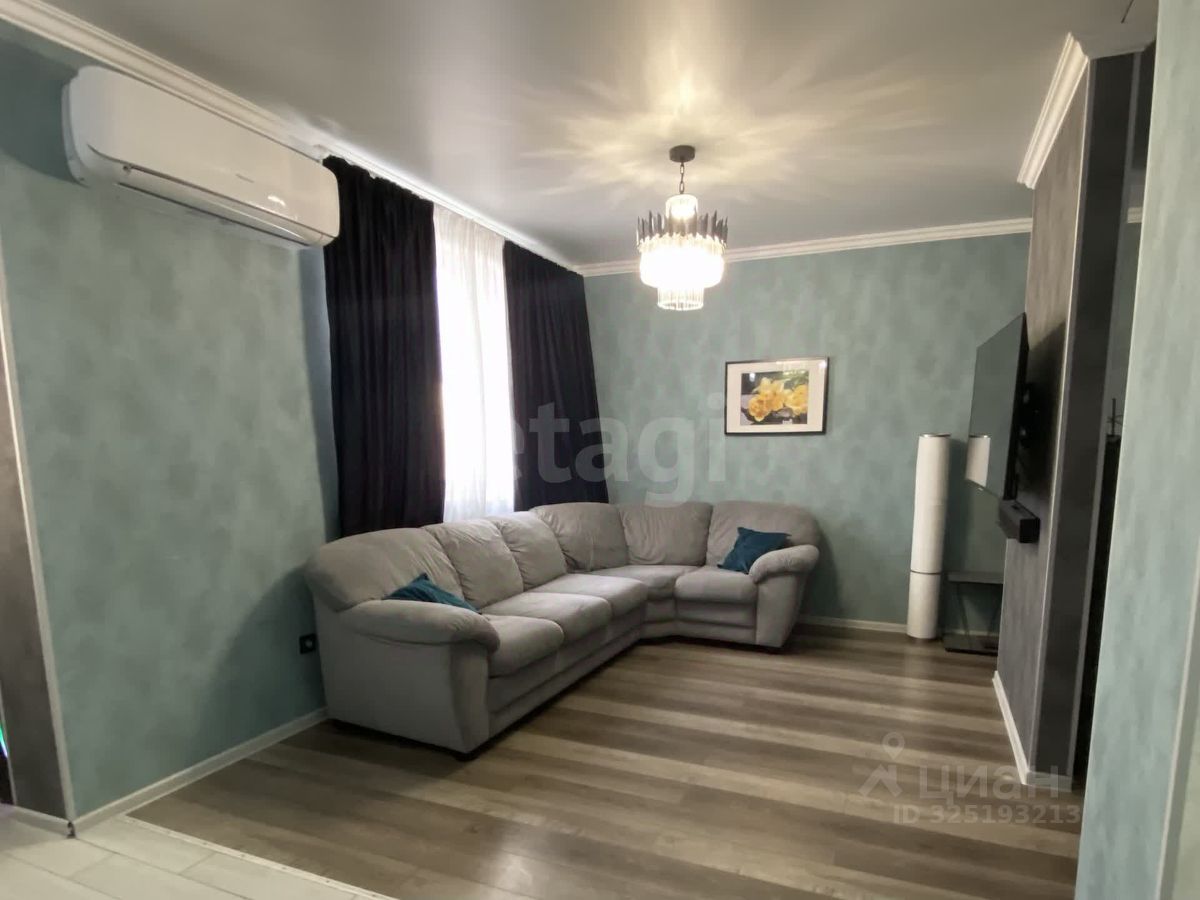 Квартира после качественного современного ремонта в спокойных серо-белых тонах с элементами голубого и серого. Всё выглядит свежо и стильно: • Кухня-гостиная совмещена с зоной отдыха: двухцветные шкафы (белый верх, серый низ), белая столешница, геометрический фартук, встроенная техника (газовая плита, духовка), холодильник, кофемашина, чайник и другая мелкая бытовая техника. • Полы — светлая плитка в кухне-коридоре-ванной и ламинат в комнатах. • Освещение — стильные подвесные светильники и люстра. • Отдельная спальня с большой кроватью, встроенным шкафом-купе с зеркальными дверями, прикроватными тумбами и элегантной люстрой. • Ванная комната полностью в плитке с душевой зоной за шторкой, современным санфаянсом и большим зеркалом. • Гостиная зоны: просторный угловой диван, ТВ-зона, обеденный стол на 4-6 человек с мягкими стульями.