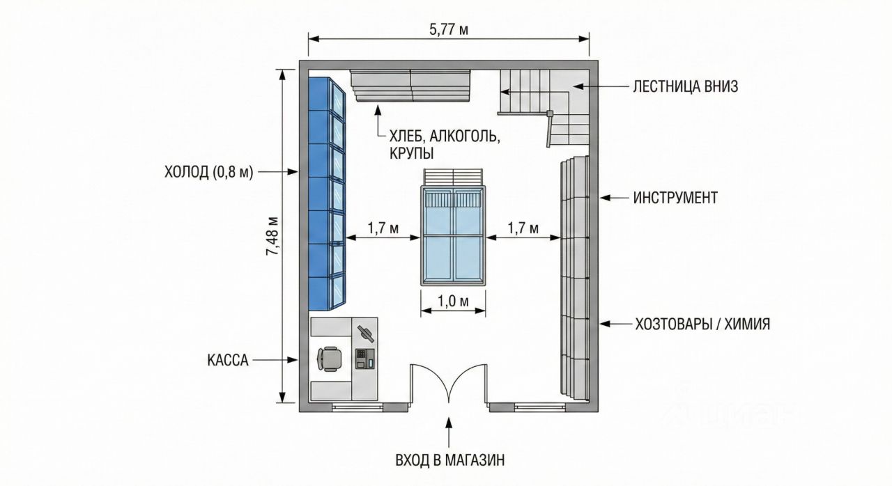 Уникальность помещения в разделении на два этажа: Первый этаж (43,2 м²) — Территория продаж. Весь объем отдан под витрины, холодильники и стеллажи. Здесь можно выставить полный ассортимент: от жвачки и свежих продуктов до инструментов и товаров для ремонта. Когда в одном магазине можно купить и еду, и шурупы — поток клиентов будет стабильно расти. Цоколь (47,4 м²) — Собственный склад. Это место для хранения запасов. Вы закупаете товар большим оптом и привозите всё сразу. Больше не нужно часто ездить за товаром — вы экономите время и деньги на доставке.