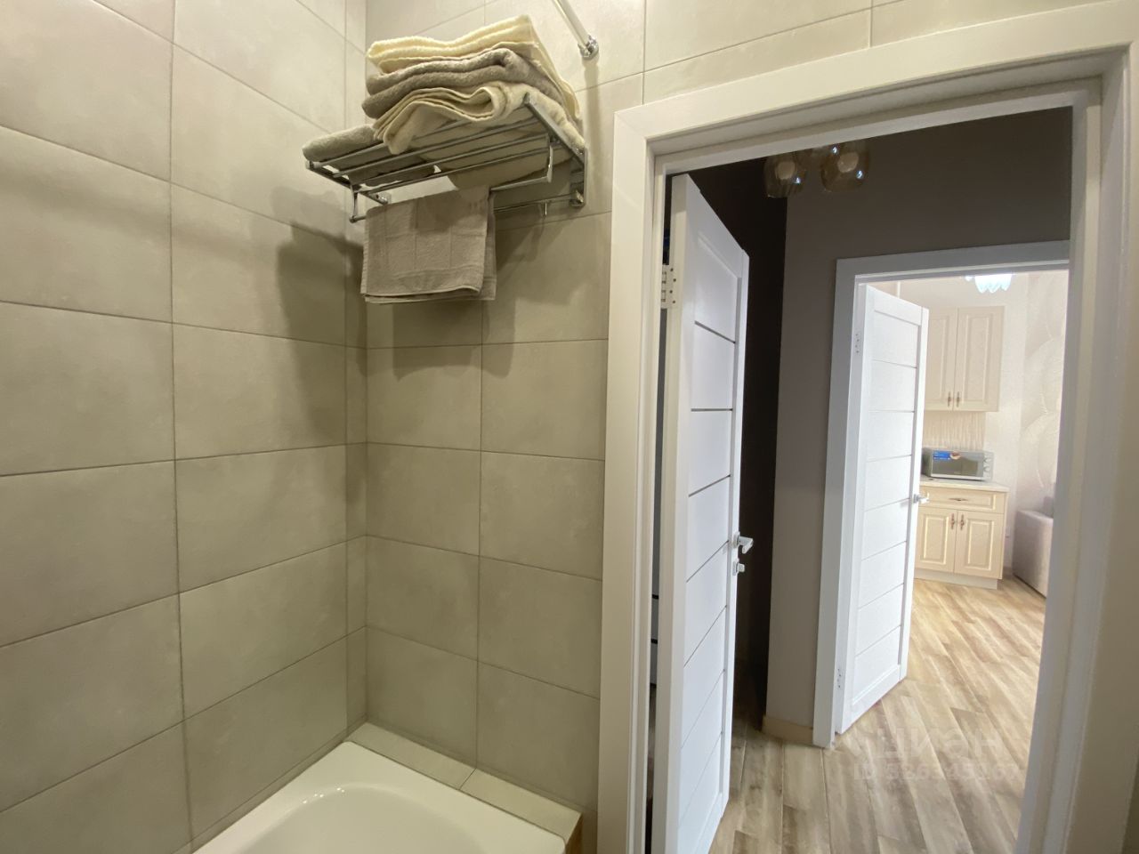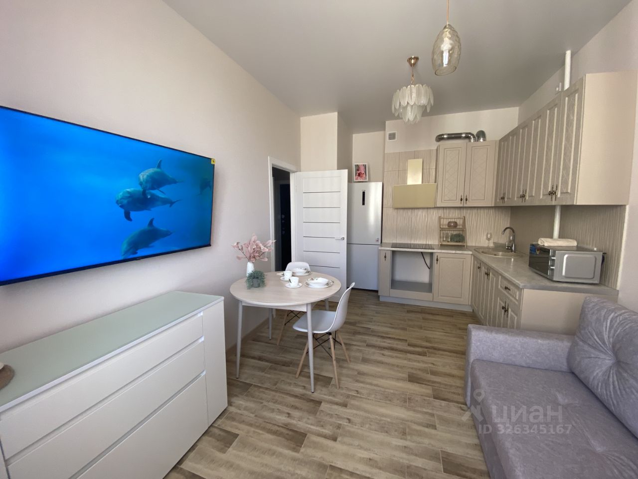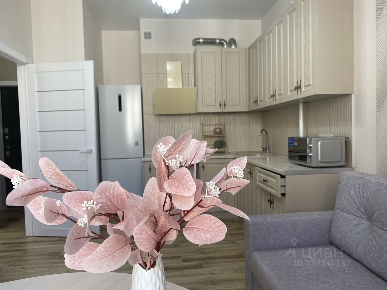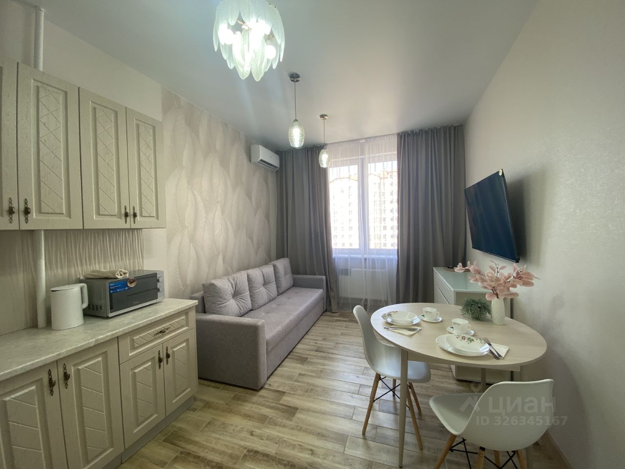 Площадь квартиры 36 м2, в кухне установлен раскладывающийся диван. Состояние мебели, техники новое. В доме два лифта.