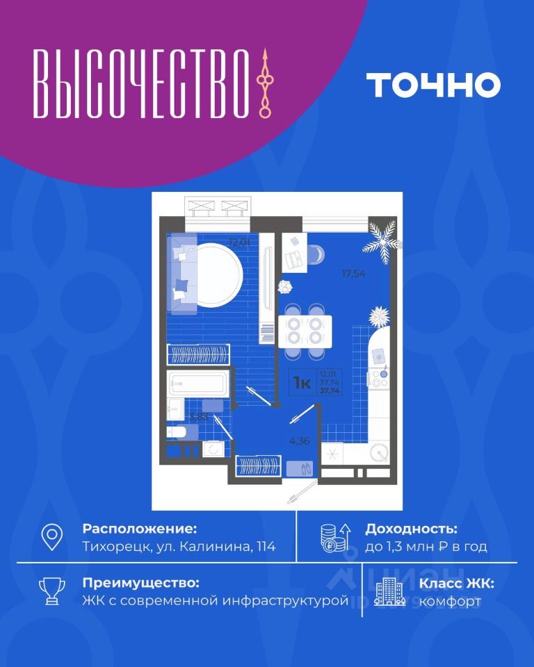 ''Высочество'' — первый ЖК комфорт-класса в Тихорецке. Современные технологии, новейшие представления о комфорте и эргономике жилья -это, то, что характеризует этот комплекс. Расположен в самом центре города. ''Высочество'' — это полностью самостоятельный жилой комплекс, жителей которого порадуют закрытый и свободный от машин двор, коммерческая галерея, спортивные и детские площадки с перголами для отдыха, уютная мангальная зона. По периметру жилого комплекса - открытый бесплатный паркинг на 370 м/мест. Недалеко от ЖК ''Высочество'' находятся детский сад, школы-гимназии, поликлиника, торговый центр, в пешей доступности расположен любимый сквер жителей города ''Звездный''.