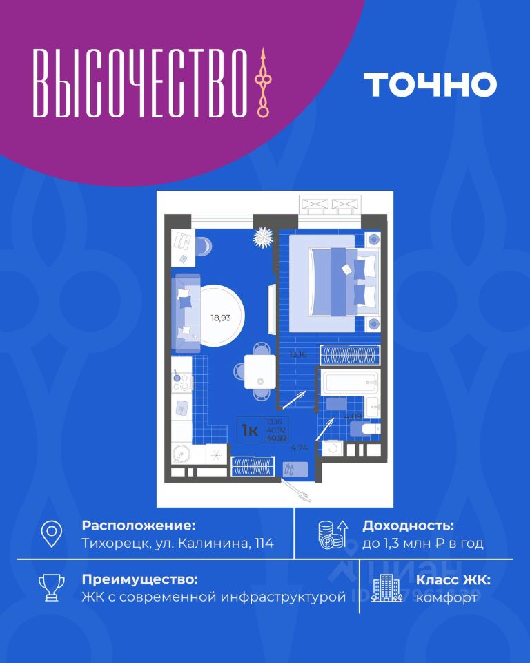 ''Высочество'' — первый ЖК комфорт-класса в Тихорецке. Современные технологии, новейшие представления о комфорте и эргономике жилья -это, то, что характеризует этот комплекс. Расположен в самом центре города. ''Высочество'' — это полностью самостоятельный жилой комплекс, жителей которого порадуют закрытый и свободный от машин двор, коммерческая галерея, спортивные и детские площадки с перголами для отдыха, уютная мангальная зона. По периметру жилого комплекса - открытый бесплатный паркинг на 370 м/мест. Недалеко от ЖК ''Высочество'' находятся детский сад, школы-гимназии, поликлиника, торговый центр, в пешей доступности расположен любимый сквер жителей города ''Звездный''.