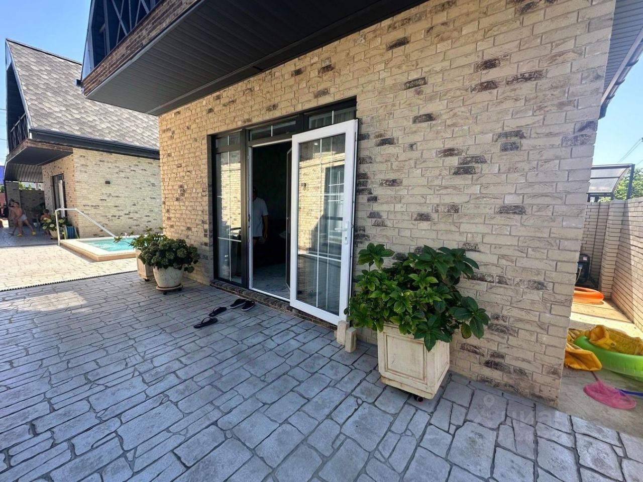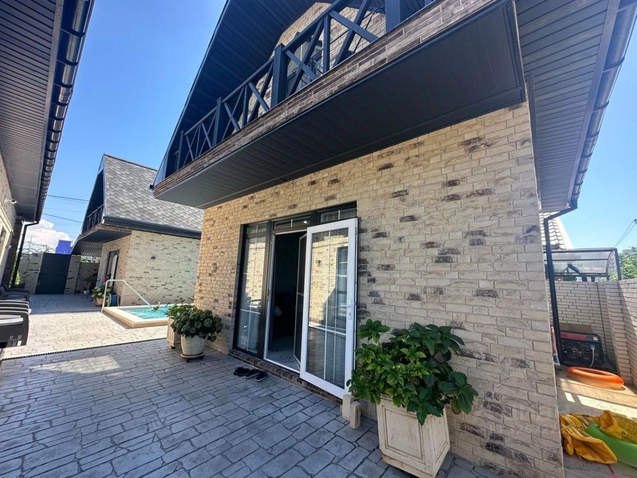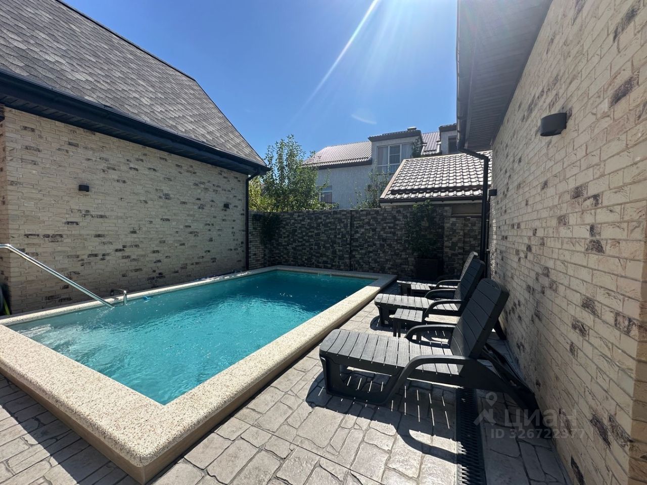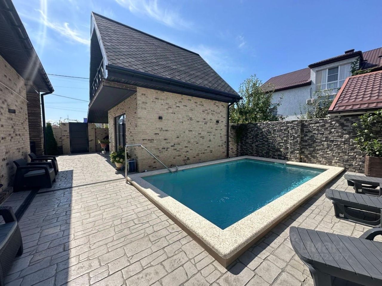 На территории имеется плавательный бассейн с подогревом+лежаки, зона отдыха, барбекю и т.д. Все центральные коммуникации, газ, индивидуальное отопление.