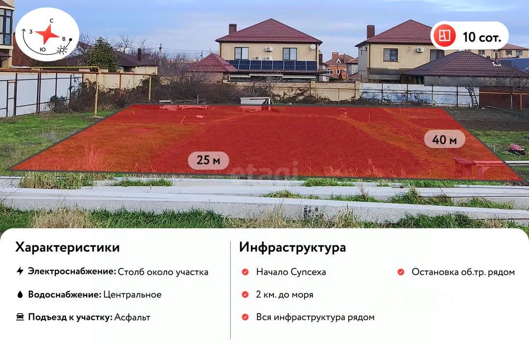 Земельный участок площадью 10 соток в поселке Су-Псех обладает выверенной прямоугольной формой 25 на 40 метра и грамотной ориентацией по сторонам света, что создает оптимальные условия для проектирования и последующей эксплуатации жилого дома. Участок полностью подготовлен к строительству: к участку уже подведены магистральный газ, электричество и водопровод. Ключевым преимуществом является развитая инфраструктура в шаговой доступности, включая торговые центры ''Красная площадь'' и ''Табрис'', а также сетевые магазины и аптеки, обеспечивающие повседневные потребности. Близость к Анапе и морю добавляет объекту инвестиционную привлекательность и потенциал для постоянного проживания или сезонного отдыха. Участок в начале посёлка, на тупиковой улице. Данное предложение представляет собой сбалансированное сочетание готовности к строительству, выгодного расположения и продуманной инфраструктуры..