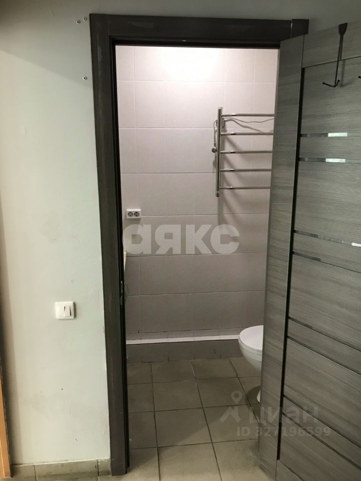Отдельный санузел с зеркалом и полотенцесушителем. Имеется перегородка и подсобное помещение со стеллажами.